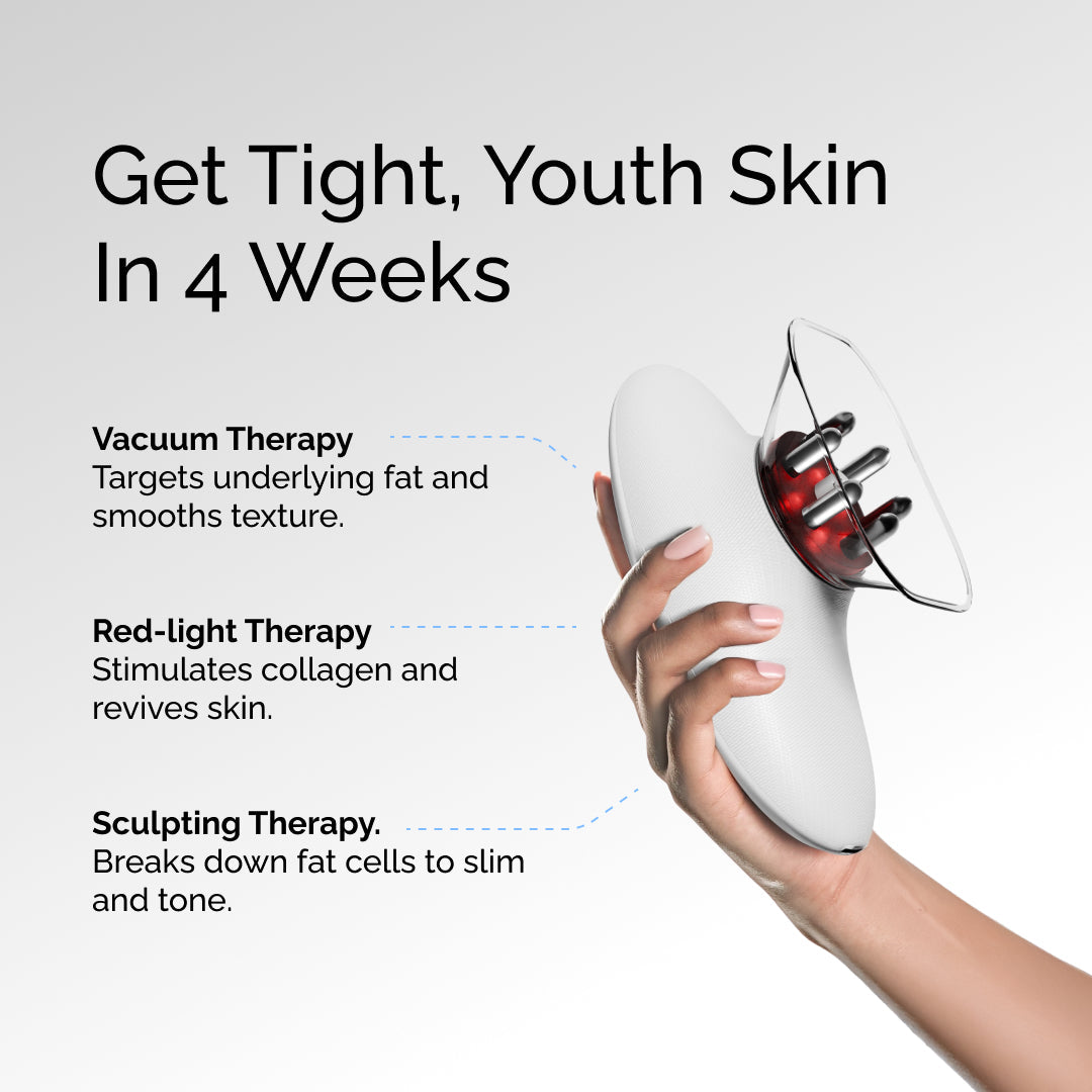 BodyCup 1.0 combines 3 powerful therapies in 1: Red-Light Therapy boosts collagen for smoother skin, Sculpting Therapy contours by targeting fat cells, and Vacuum Therapy lifts and firms problem areas delivering professional results at home.